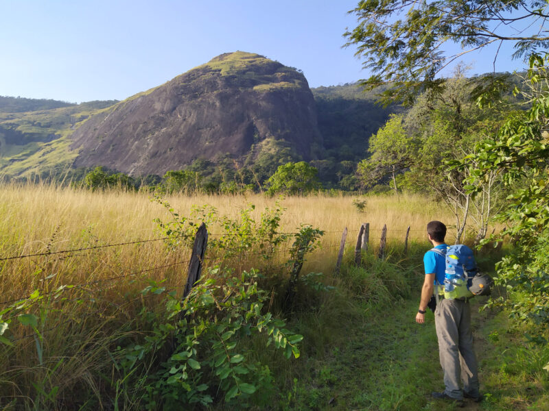 Quando chegamos lá, mesmo tendo visto as fotos e relatos, nem acreditei que o município nos guardava esta pérola. Um local de características rurais e um visual incrível. A montanha era linda, e ao avistá-la ambos concordamos em ir na direção do vale, face sudoeste, para explorar em busca de uma via um pouco mais vertical. O caminho foi bem fácil, sendo curto e com visão da montanha quase o tempo todo, por isso chegamos na montanha sem muito esforço. Importante frisar que a trilha passa por uma propriedade privada, porém o dono foi bem receptivo, não viu problema com a nossa presença e inclusive nos deu dicas para chegar lá.