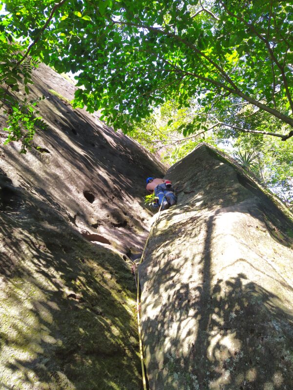 Combinamos de ir no dia 16 de janeiro de 2022. Isso mesmo, no verão! Escalamos o trecho conquistado e chegamos na florestinha exaustos. O objetivo era explorar em busca de uma nova base para dar sequência à via, que ganhou uma trilha no meio da parede. Não é só bater grampo que dá trabalho não. Abrir trilha também tem suas dificuldades: escolher o caminho, levando em conta a direção desejada e os obstáculos pela frente, como espinhos e cipós. Sem contar os marimbondos que nos atacaram.