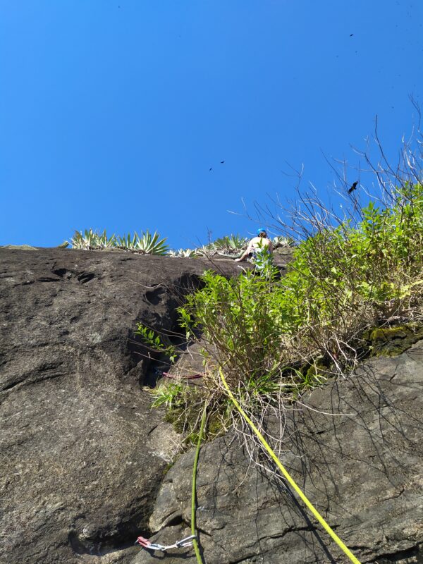 Passados mais cinco dias e estávamos nós de volta à parede para conquistar um dos lances mais bonitos da via: o lance da aresta! Logo após o P3, com ajuda do Magalhães que apontou um possível traçado passando pela aresta (enquanto eu estava buscando um caminho com muita vegetação) consegui vencer um trecho que alterna entre agarras e aresta, com a utilização de dois móveis. Porém, o lance ficou um pouco exposto demais e não é facil (eu não ia querer guiar aquele lance de novo rs) a ponto de colocamos uma chapeleta intermediária para reduzir o risco. Mais 30m de via e definido o P4.
